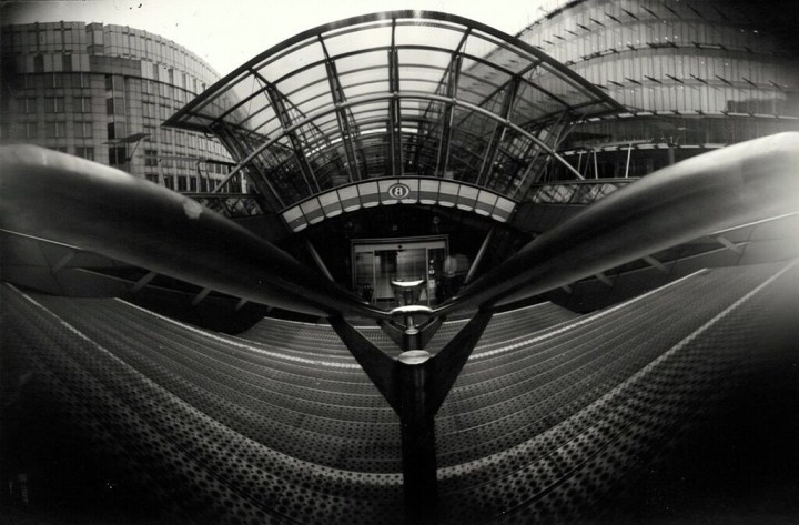 Gare du Luxembourg – ©Chris Reuland Pinhole cameras, by definition, use no lens. Instead, light is focused by a tiny hole; oftentimes it is literally a hole made with a pin. The camera relies on the property of light to travel in a straight line. The numerous rays of light from a scene are projected individually through the pinhole and onto the photo taking medium (film, photo paper, or digital sensor). Because the pinhole is tiny, often fractions of a millimeter, the f-stop of such cameras tend to be very high numbers – usually above 100. Consequently, exposure times usually range from about a second to 10 or more minutes. In addition, the tiny pinhole aperture provides almost infinite depth of field, usually extending from an inch in front of the camera to infinity.