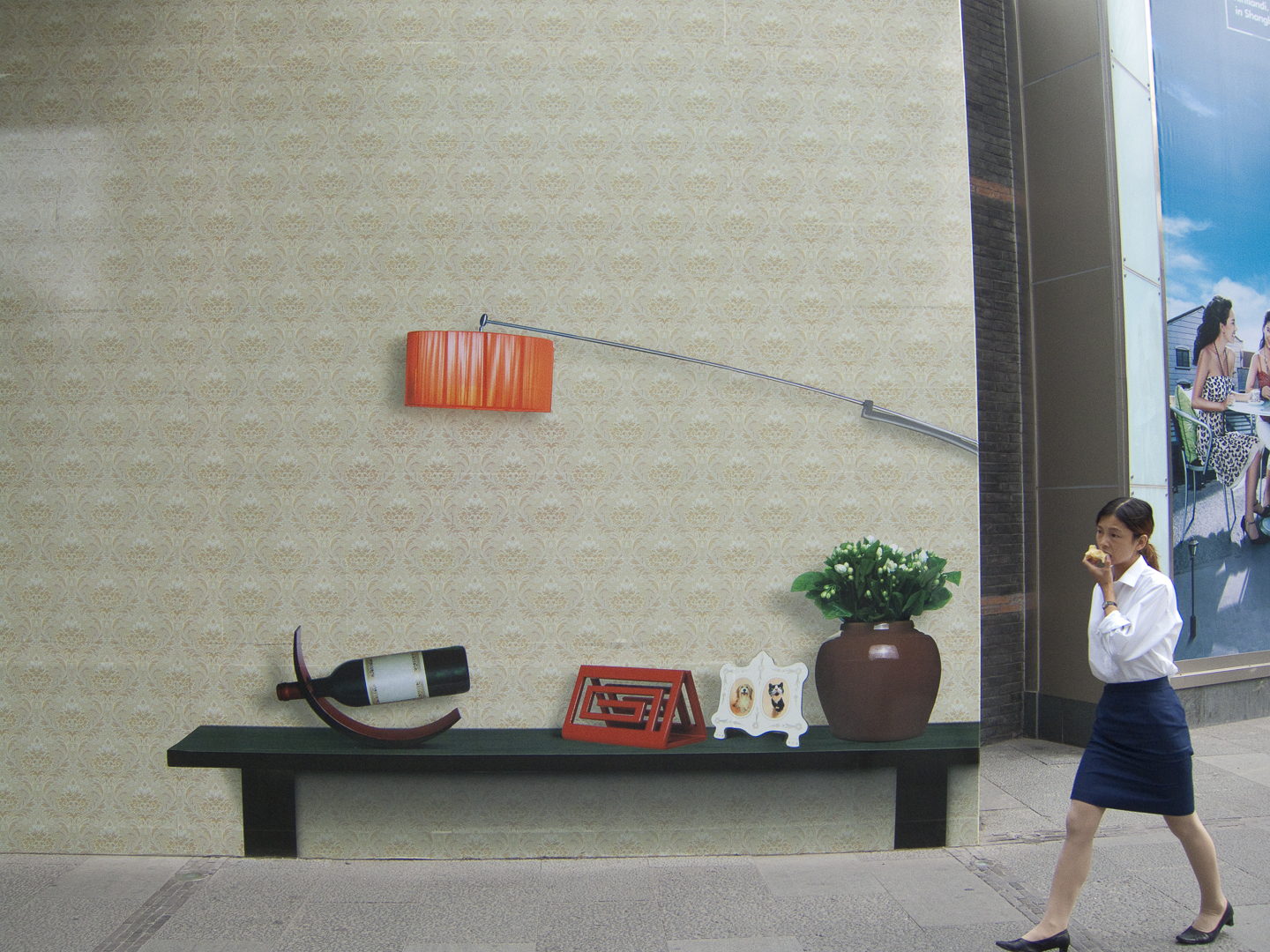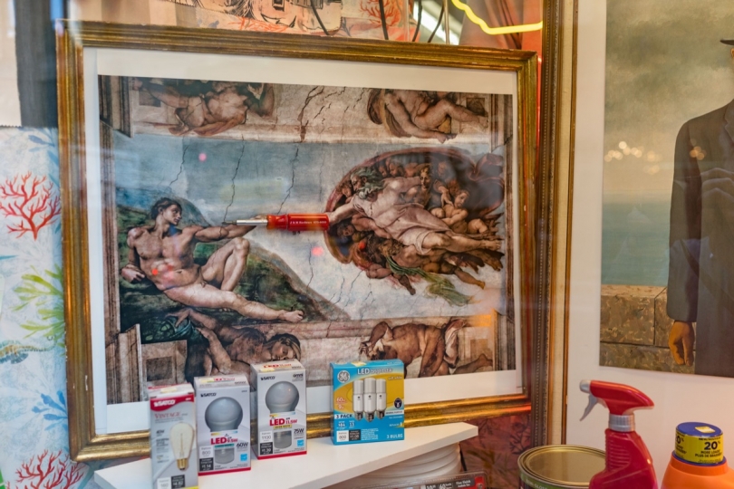 Over the span of the book we see the Michelangelo fresco painting of the Creation of Adam in several iterations. We see it in a hardware store, a poster reproduction poorly framed within a larger gold frame mounted to a wall, or in a faded wallpaper pattern behind a framed photo of a wedding portrait with bride and groom in a similar pose, touching hands, creating a future together. Traub captures an image of faux wooden boards with painted shadows on a flat metal door, mimicry of floral patterns on upholstery and carpet placed in front of a nature scene right outside the window. These witty visual interplays beg the viewer to think about visual reproduction, visual representation, and realistically… it can be humorous how people often choose to replicate a natural environment in such unnatural ways.