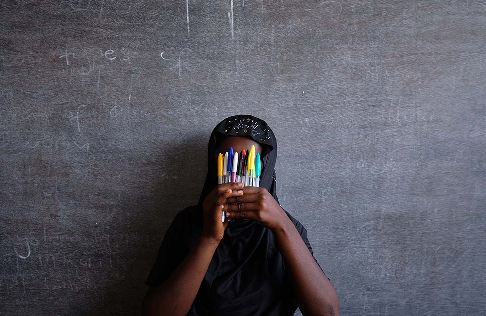 His series “Heroes” is centered around a group of girls who were abducted by Boko Haram militants operating in northeast Nigeria. Some of these girls gained their freedom after the camps where they were held were raided by military troops, while some other girls sought help from authorities and escaped when they were forced to act as suicide bombers by Boko Haram. The intensity and hardship endured by those girls in captivity is contrasted by striking portraits of the girls standing in front of blackboards, holding books or school supplies. Their hopes for continuing their education and embracing learning are the antithesis of Boko Haram’s attempts.