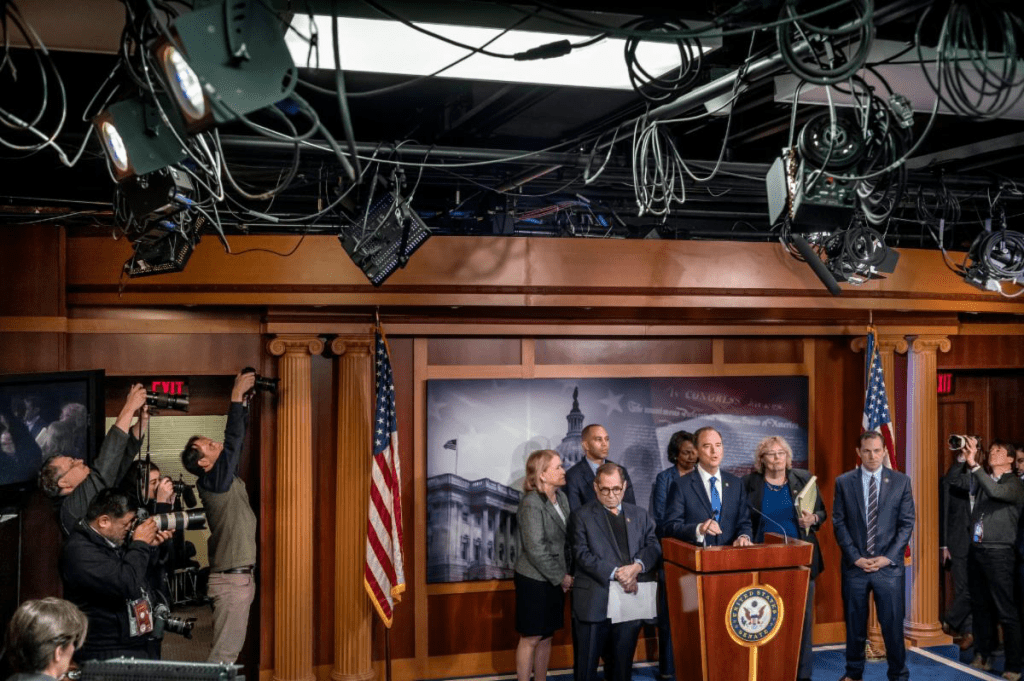 Act II moves to Washington, D.C. capturing the chaotic atmosphere within the political machine. Scenes from the White House and the Comey, Mueller, and impeachment hearings are treated almost as if they have taken place on stage or a movie set. The photographer has pulled back and shot wider than most news photographs giving more context and information to future historians, or anyone interested in what this period of time looked and felt like.