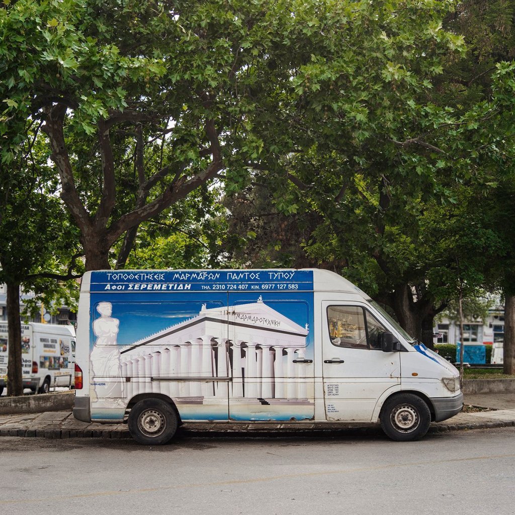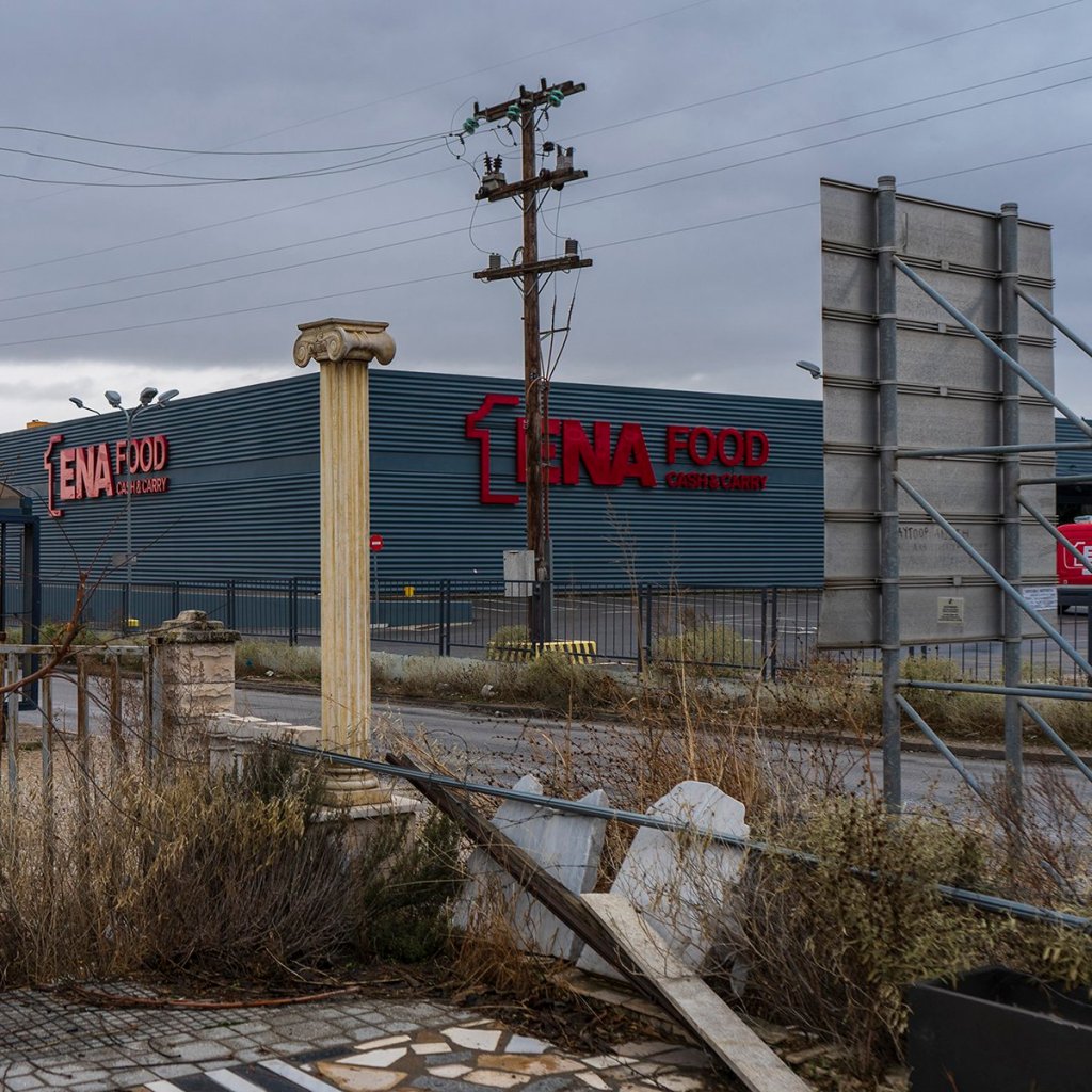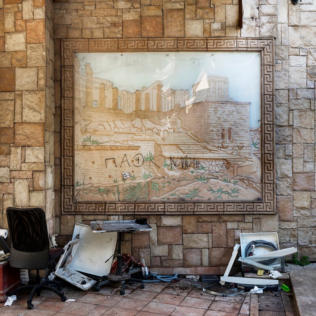 The aforementioned phrase was the title of a project by a fellow photography student who documented ‘mis-placed’ architectural features – like faux-Greek Doric, Ionic, or Corinthian plastic columns on local pizzerias, hair salons, or a fast-food hamburger building. Without needing to comb the American Midwest for examples, Nikos Priporas has the real McCoys and their imitators. The results are an ironic, witty interplay of images.