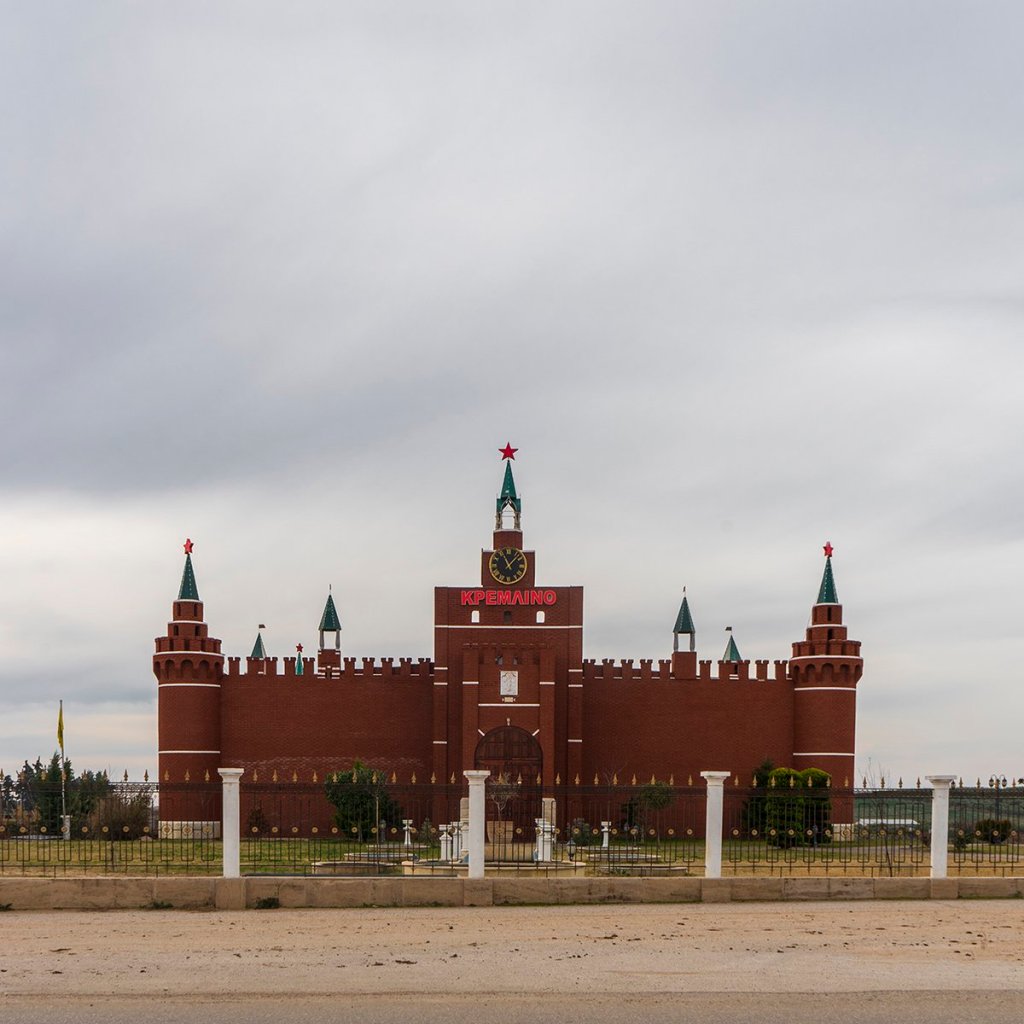 Throughout these reconstructions which mime ancient monuments and statues, one can witness the marching of representations of popular emblems, as well as symbols that, due to the recent political developments regarding the name of North Macedonia, became objects of quarrel. In these images, surrounded by square frames and despite their strictness, one can witness the playful, even ironic, mood of the photographer.