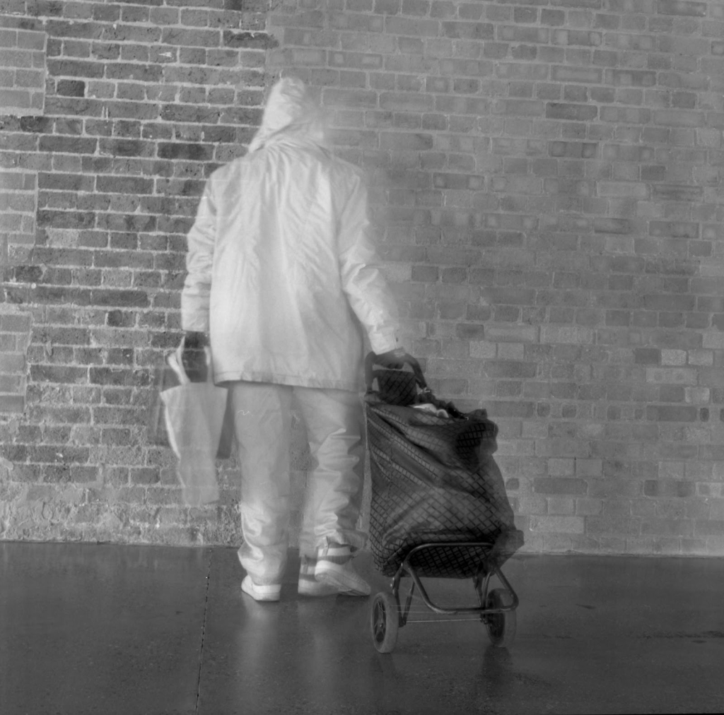 Hélène Amouzou was born in the Togolese Republic in West Africa. In 2004, she went to study photography and video at the Sint-Jans-Molenbeek Academy of Drawing and Visual arts in Brussels, where she still lives and works today. Over the course of the ten-year period that Hélène spent waiting to be granted asylum in Belgium, she made a series of analogue self-portraits. These captivating works play with the notion of sight and invisibility, thus expressing the artist’s uncertain existence. Her lack of recognition, stigmatisation and marginalised position sometimes translate into a blurring and haziness. In other images, the artist shuts away herself or her possessions – for example clothing or suitcases – in an empty attic room, waiting for the moment when she will once again be able to reinsert these into a home. Finally, she also tries to explore her changing relationship to African culture through traditional costume and objects. The slow method of the photography chimes with the meditative nature of Hélène’s practice and the limited resources with which these photographs were created.