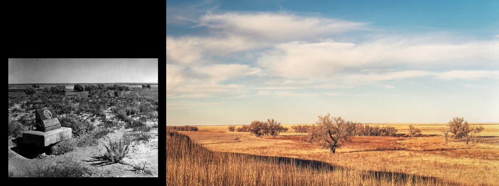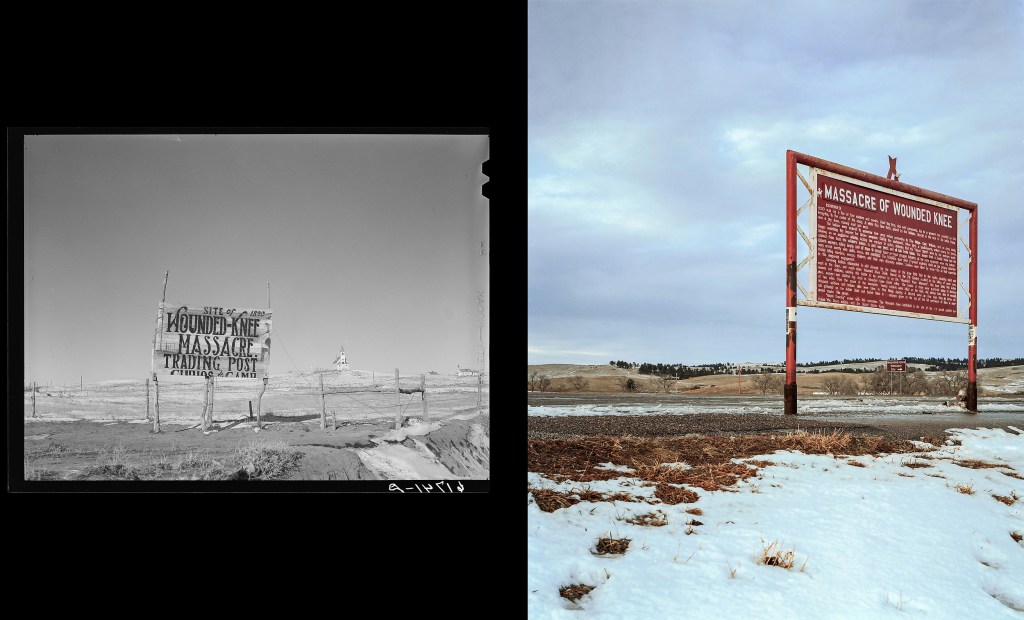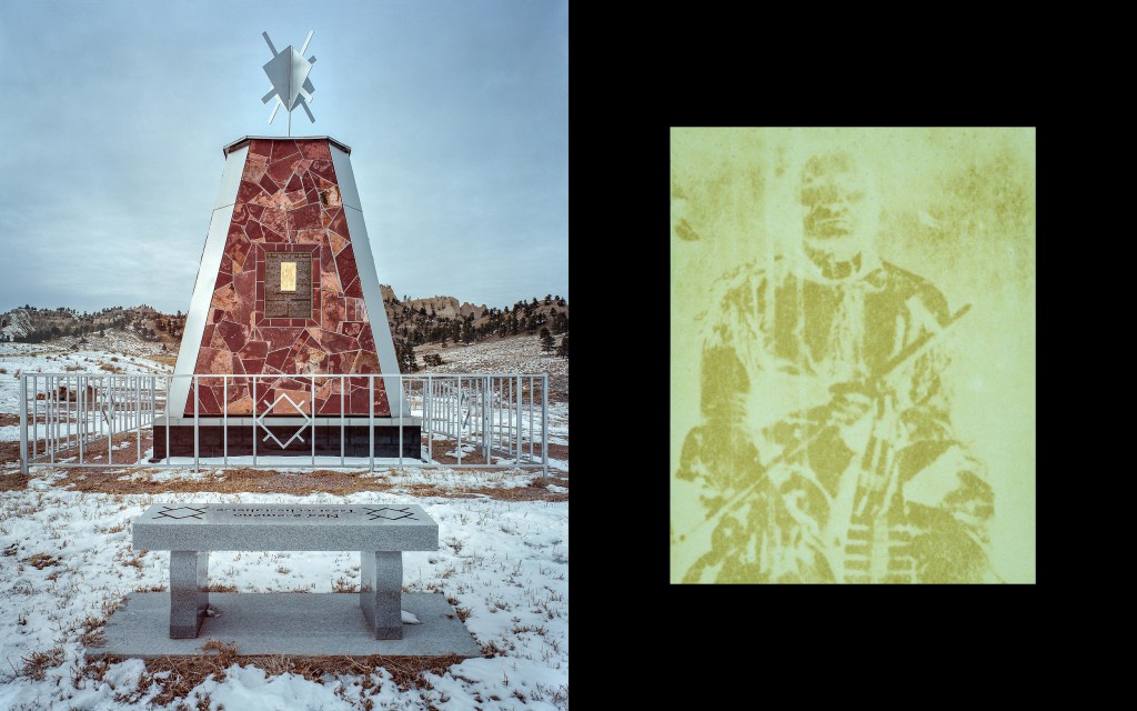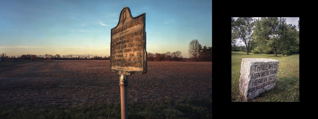 Though grounded in landscape photography, elements of memorialization, both past and present, are incorporated. Just as important as the events themselves, the history of how we have come to remember and memorialize them reflects a societyโs understanding and values at any given moment in time. The memorials and names given to these events imply interpretation, which in turn rely on a broad consensus of how an event is understood. History is curated, and whether or not a massacre is remembered and acknowledged oftentimes depends on who is doing the remembering. As the Shawnee leader Chiksika once observed: โwhen a white army battles Indians and wins, it is called a great victory, but if they lose it is called a massacre.โย